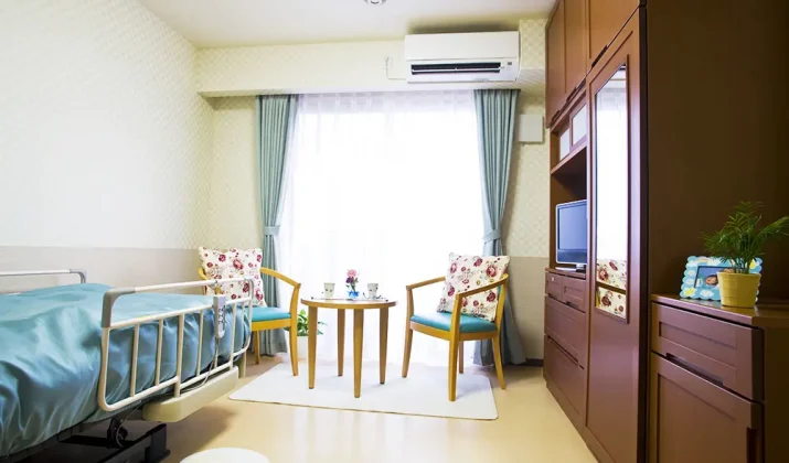 | 居室設備 | オゾン消臭装置、収納家具、冷暖房、天井照明、電動リクライニング式ベッド、温水洗浄便座付トイレ、応接セット、木製キャビネット、洗面台、カーテン、フットライト、コールボタン、スプリンクラー |