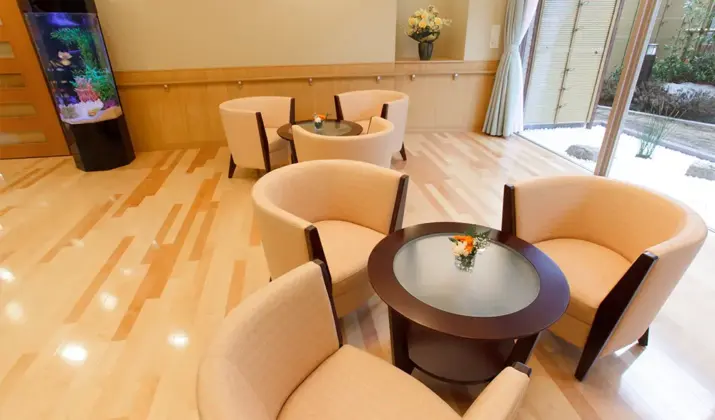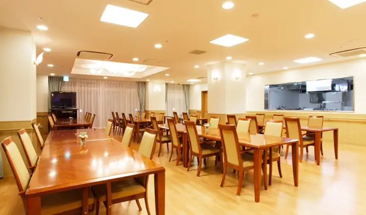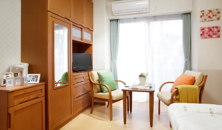 | 居室設備 | オゾン消臭装置・収納家具・冷暖房・天井照明・電動リクライニング式ベッド・温水洗浄便座付トイレ・洗面台・応接セット・木製キャビネット・カーテン・フットライト・コールボタン・スプリンクラー |