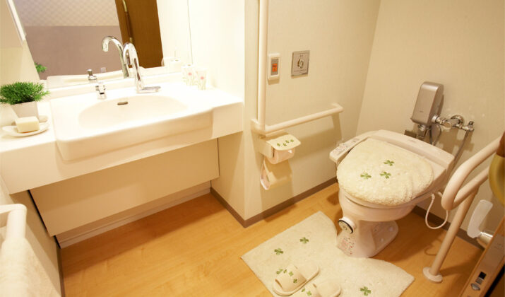 【洗面・トイレ】車椅子での移動もスムーズな広さを確保、介助バー、コールボタンも装備しています。