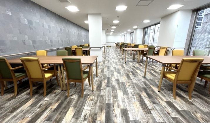 【食堂】開放的な空間で、テーブルがゆったりと配置されています。