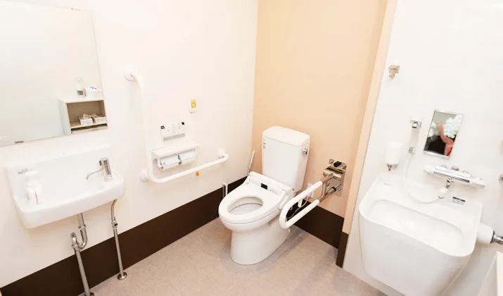 【トイレ】清潔感溢れるお手洗い。車椅子でもゆったりとお使いいただけます。
