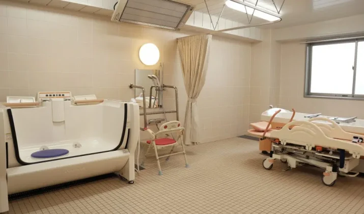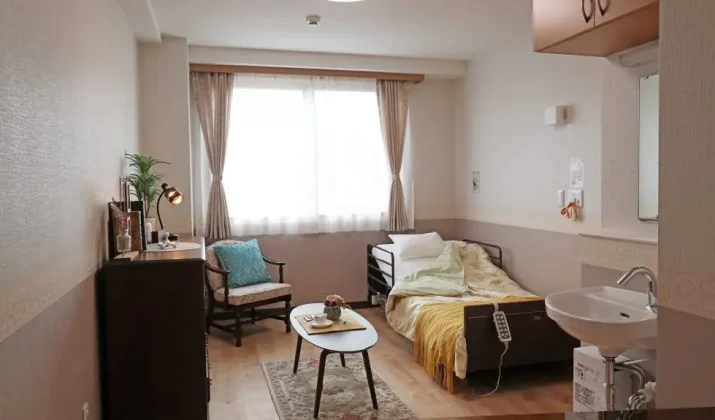 居室設備 | 介護ベッド、シャワー付きトイレ、洗面台、エアコン、クローゼット、カーテン、ナースコール、スプリンクラー、電話端子、テレビ端子、有線LAN |