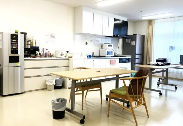 【共有スペース】食堂兼談話室、共有浴室がございます。脱衣室には洗濯機もございます。