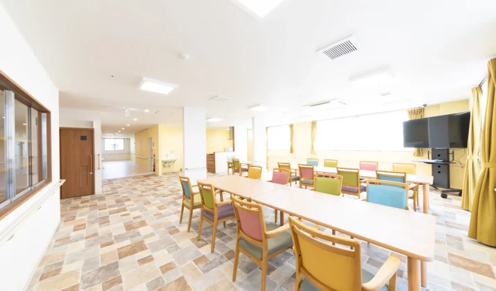【共用スペース】明るい色合いで元気が出るような、入居者様の集いの場です。