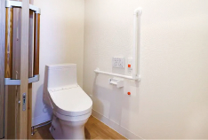 【トイレ】バリアフリーのトイレは、複数の手すりや緊急通報装置が設置されています。