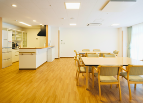 【食堂】陽ざしがやわらかく差し込む明るい空間で、入居者様の集いの場です。