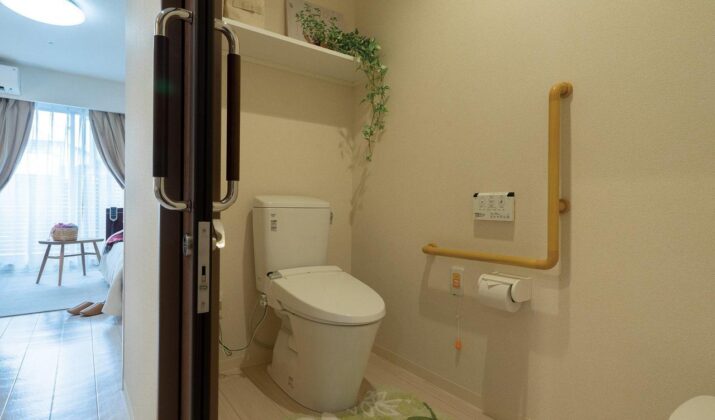 【居室トイレ】手すりやケアコールを完備、緊急時はスタッフを呼べるので安心です。