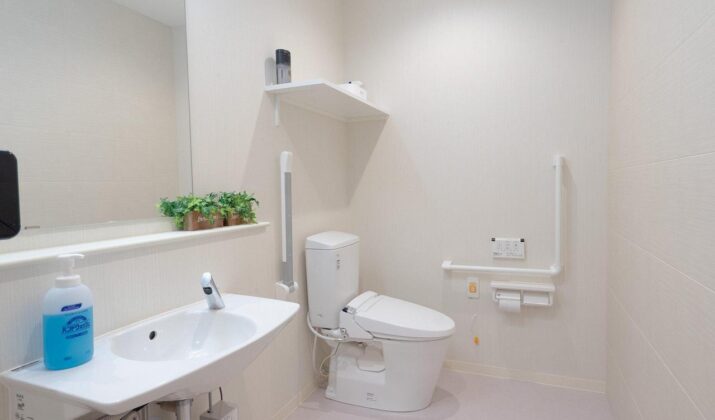【共用トイレ】オストメイト対応のトイレです。手すりやケアコールを完備。