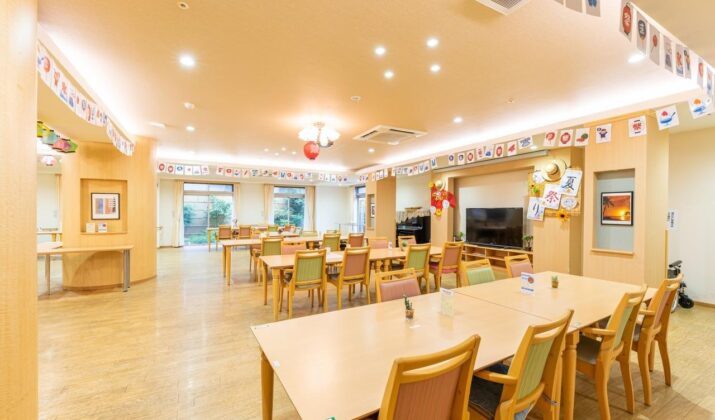 【食堂兼機能訓練スペース】明るく開放的で温かい雰囲気の、全員が集まれる食堂です。