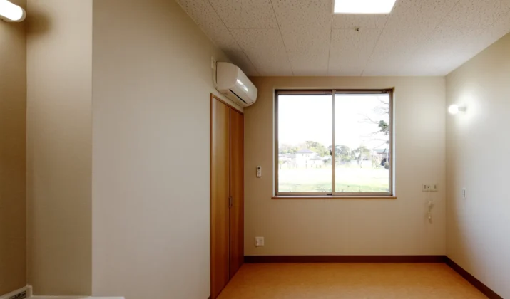 【居室 (三番館)】完全個室で洗面台、エアコン、クローゼットが完備されております。窓からは自然を眺めることができます。