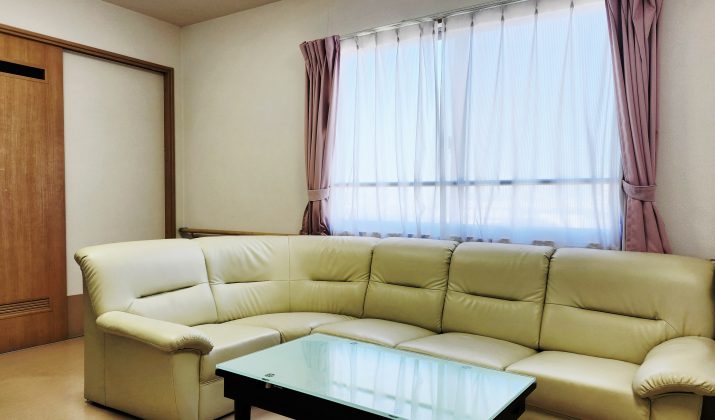 【デイルーム】来客の時、入居者様同士でのくつろぎのスペースとしてご自由にお過ごしいただけるスペースです。ゆったりとしたソファで、のんびりできそうですね。