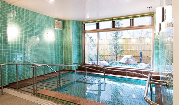 【一般浴】清潔感にあふれ、設備も整っています。坪庭の眺望を楽しみながら入浴できる一般浴槽。