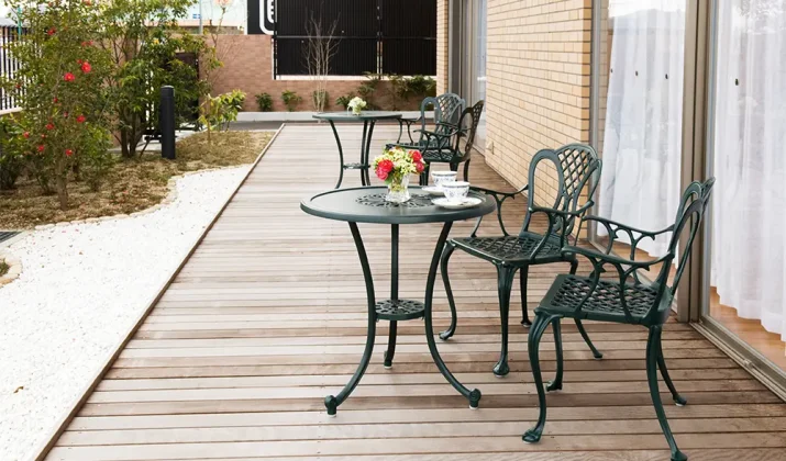 【ウッドデッキ】食堂からベランダに出られ、日光浴も気軽にお楽しみいただけます。