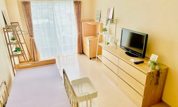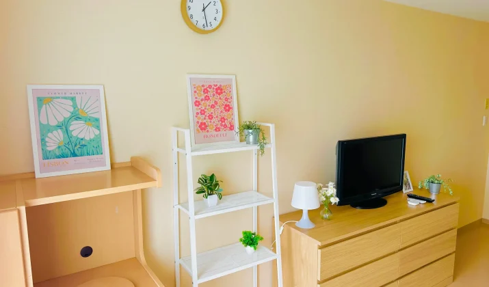 ・お部屋は個室で、大型の収納シェルフ・テレビ・ハンガーラック・飾り棚を完備しています