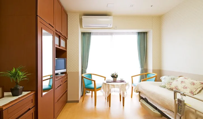 | 居室設備 | オゾン消臭装置、収納家具、冷暖房、天井照明、電動リクライニング式ベッド、温水洗浄便座付トイレ、応接セット、木製キャビネット、洗面台、カーテン、フットライト、コールボタン、スプリンクラー |