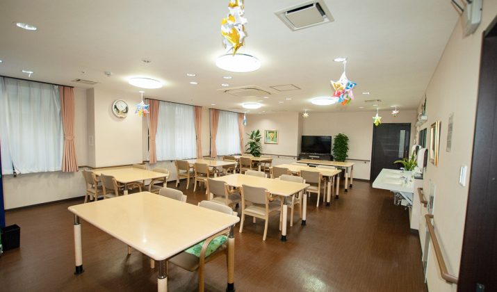 【食堂兼多目的ホール】明るく開放的な団らんの場です。食事は必要な栄養量を確保し健康に配慮した、家庭的で高齢の方に馴染みのあるメニューです。 季節を感じる変化のある食事提供に力を入れています。行事食メニューも好評です。