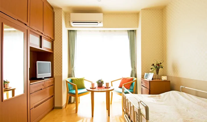 | 居室設備 | オゾン消臭装置、収納家具、冷暖房、天井照明、電動リクライニング式ベッド、温水洗浄便座付トイレ、洗面台、応接セット、カーテン、フットライト、コールボタン、スプリンクラー |