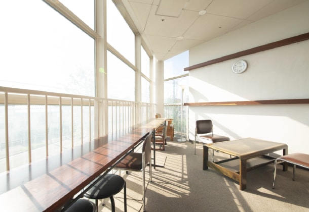 【談話スペース】大きな窓の開放感あふれる空間で、ゆっくりご歓談をお楽しみいただけます。