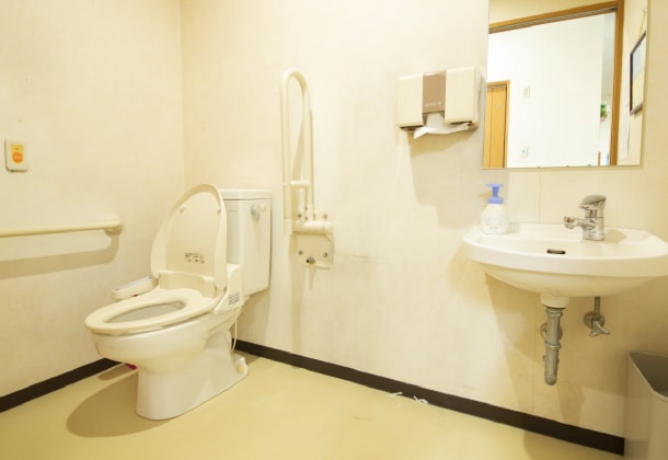【トイレ】広いスペースを確保、可動式の手すりやナースコールが完備されています。